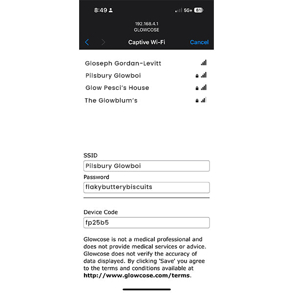 Note: It may take a a few seconds for the Configure Glowcose page to display while it searches for available networks.